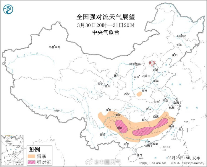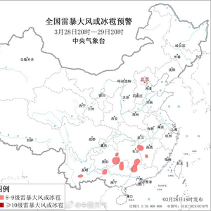 【今年首个!中央气象台发布强对流天气预警】#今年首个强对流预警来了#中央气象台3月28日18时发布强对流天气蓝色预警:预计3月28日20时至29日20时,湖南东北部和南部、江西中西部、广西北部和西部、广东西北部、云南中南部、贵州东南部等地的部分地区将有8级以上雷暴大风或冰雹天气;湖南西部和东部、江西西部、广西西北部、广东北部、重庆南部、贵州中南部等地的部分地区将有小时雨量大于20毫米的短时强降水天气。#南方迎今年首场大范围强对流# 预计,强对流的主要影响时段为明天下午至夜间。