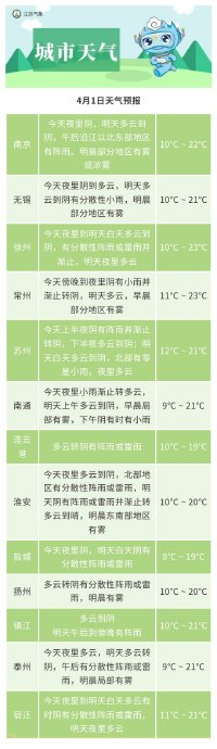 #城市天气#今夜到明天沿江以北地区多云转阴有分散性阵雨或雷雨,其他地区阴有小雨并渐止转阴到多云。最高温度:本省西北部地区22℃左右,其他地区19~20℃。最低温度:江淮之间东部地区8℃左右,其他地区9~10℃,具体请见各城市天气预报。