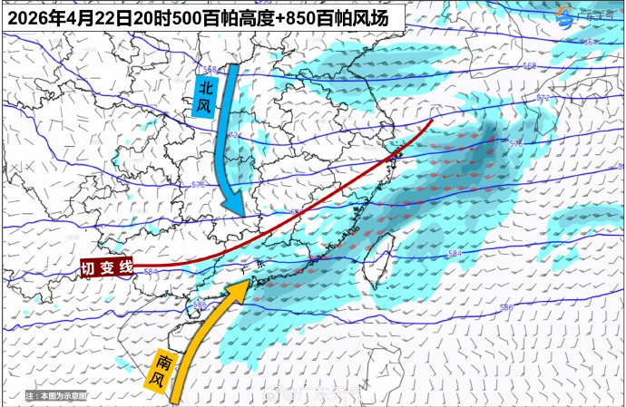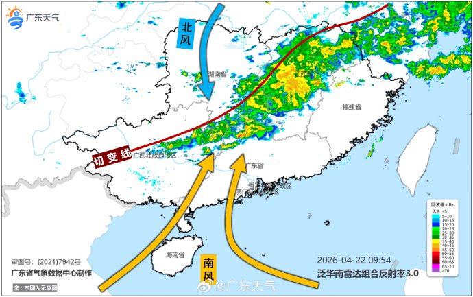 【#广东天气剧透#】今天(4月22日)上午,从天气雷达图可见,冷暖气流交汇所产生的锋面雨带已南压至华南北部,广东的韶关、清远及肇庆一带已出现频繁的雷雨天气。
