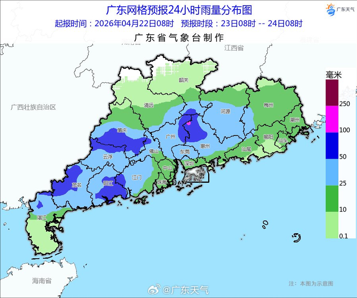 24日到25日,雨带继续南压,南部沿海市县多雷阵雨或阵雨,其余地区降雨减弱,以多云天气为主。#22至23日雨带南压影响广东#