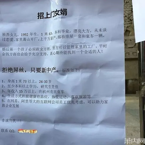 上周,在杭州万松书院的相亲会上,有人发现了一则萧山人招上门女婿的消息,而且要求很独特,写着“拒绝屌丝,只要新中产”。
